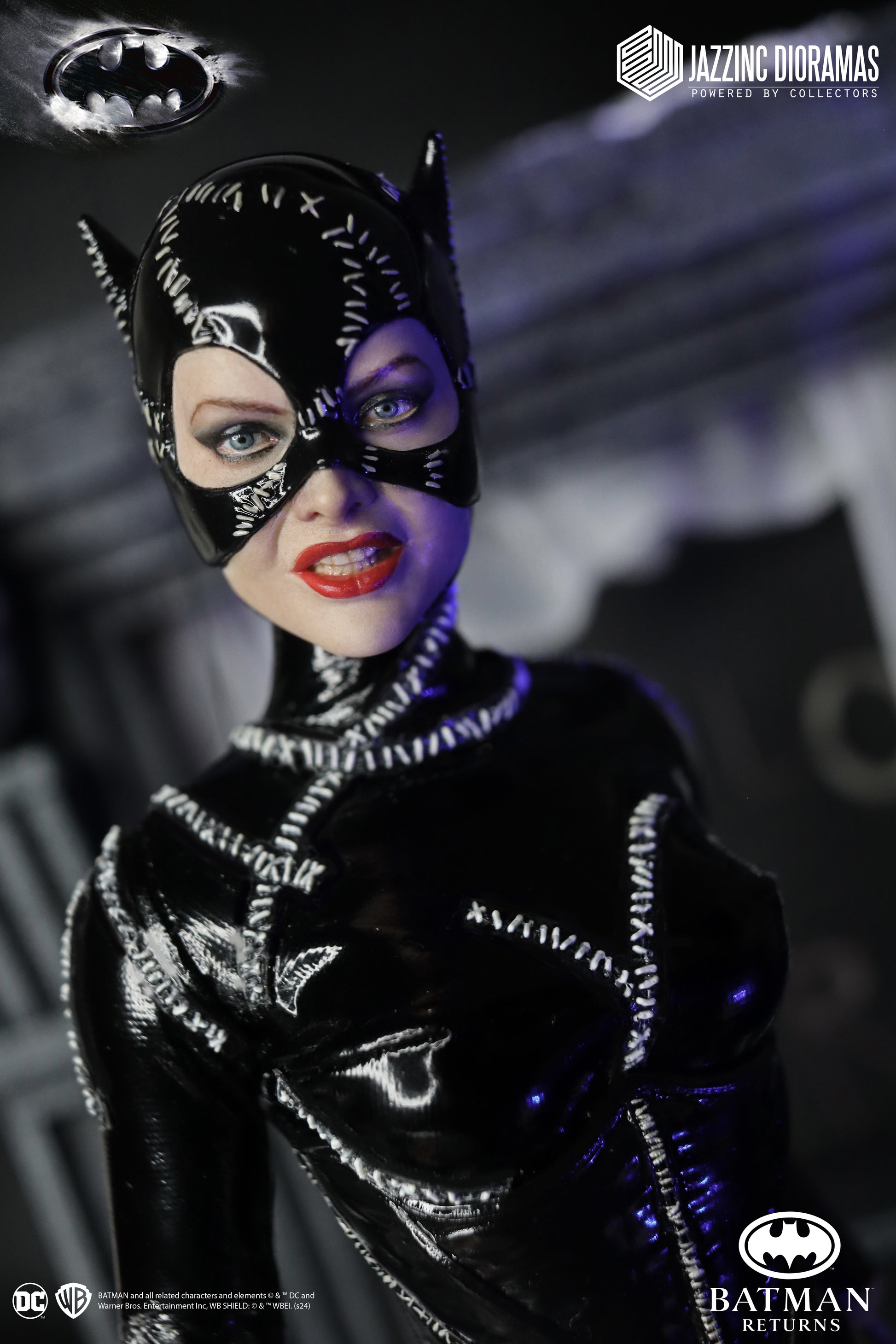 And now Jazzinc, in a partnership with Warner Brothers, is beyond honored to present the first ever officially licensed sixth scale Catwoman figure from Tim Burton’s sequel in all of its stunning purrfection. From the body suit’s silicone sheen, to the exactitude of the erratic stitching, to the distinctiveness of each individual claw, to the replication of Michelle Pfeiffer’s manic expressions, every detail was obsessed over, and consumed the attention of our design team for enough hours to practically qualify as nine lives worth.